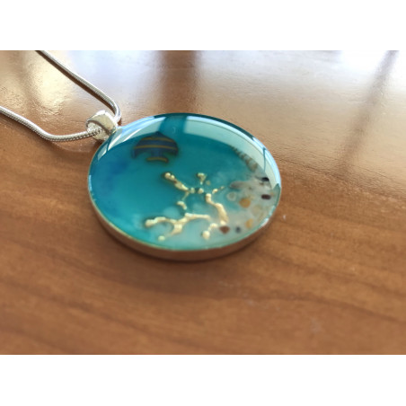 This silver plated pendant was inspired by the ocean. It has beautiful shades of blue & turquoise and is enhanced with a tiny fish, gold metallic coral, shells and tiny pebbles from the beach. The necklace comes with a silver chain and is presented in a soft black velvet pouch.