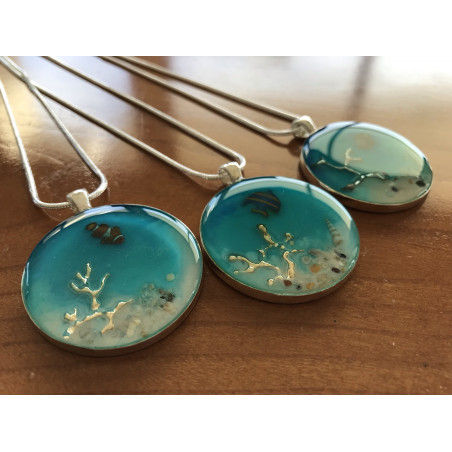 This silver plated pendant was inspired by the ocean. It has beautiful shades of blue & turquoise and is enhanced with a tiny fish, silver metallic coral, shells and tiny pebbles from the beach. The necklace comes with a silver chain and is presented in a soft black velvet pouch.